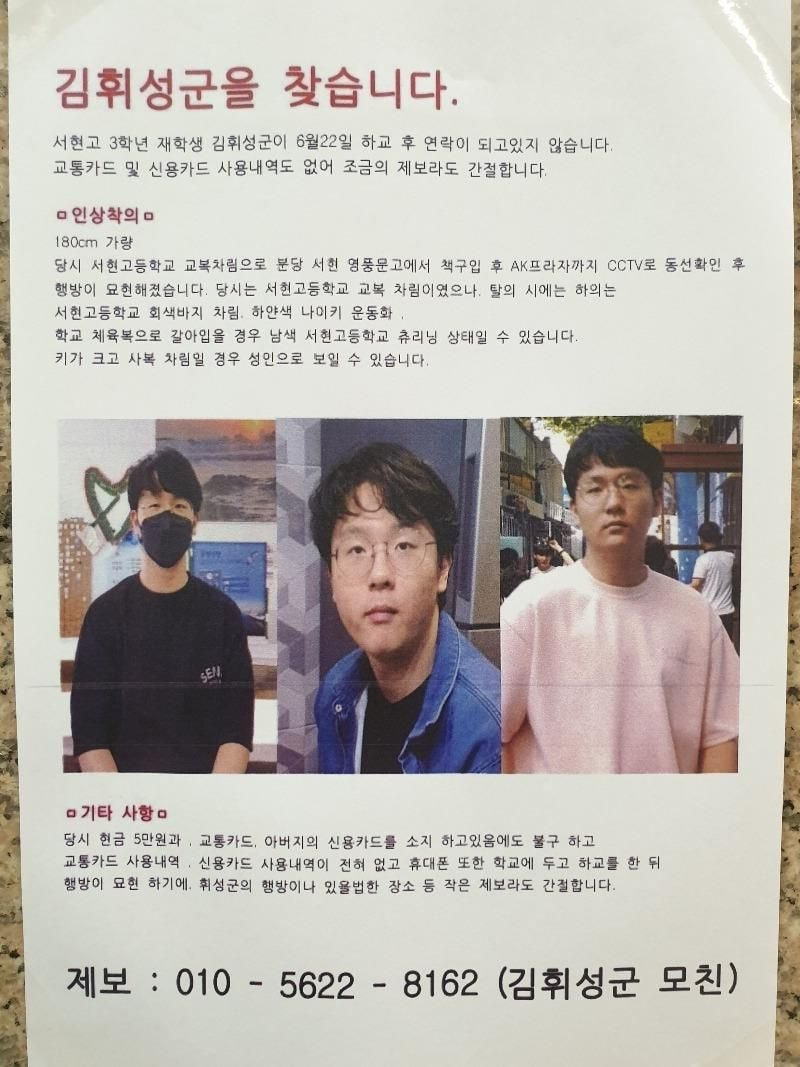 벌써 닷새 째인데…분당 서현고 김휘성 군 CCTV에 포착된 마지막 ... from dispatch.cdnser.be 6월 22일 방과후 gs25 분당 한양점에서 교통카드에 만 원을 충전하면서 종량제 봉투를 구입하였다. 김휘성 군, 오늘 새벽 6시 반쯤 숨진 채 발견성남 분당구 새마을연수원 앞 야산 능선에서 발견경찰 지금까지 타살 혐의점 없어앵커지난 22일 이후 실종된 분당 서현고등학교 3학년 김휘성 학생이. 김군은 실종 당일 하굣길에 서현역 서점에 들러 아버지 신용카드로 책을 사고, 거리로 나와 버스정류장으로 이동한 후 현재까지 행방이 묘연한. 싱글벙글 성남 실종 게이 디시닉 유출한 새끼 사과문. 오후 5시 20분경에는 부친의 신용카드로 영풍문고 분당서현점에서 수능완성 등 5권의 문제집을. 실종된 경기 성남시 서현고 3학년 김휘성 군이 숨진 채 발견됐다. 지난 22일 하교 후 실종된 성남시 분당구 서현고 3학년 김휘성군이 28일 숨진 채 발견됐다. 분당 고3 ㅠㅠ숨진 채 발견 23.